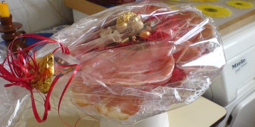 Da denkt man als Kerl immer – „Pah, Blumen, sowas brauch ich nicht“ – der Strauß, der allerdings vorhin in meinen Schuhen steckte, ist das perfekte Geschenk für jeden Mann. Er besteht nämlich aus einzelnen Packungen Schinken, Salami & Co, zusammengestellt von einem ortsansässigen Fleischer. Eine wirklich tolle Idee und an dieser Stelle vielen Dank an den fleißigen Rotmantelträger für das leckere Geschenk